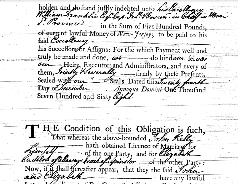 Colonial Marriage Bond Volume K p. 349 John Kelley to Elizabeth Cushlow—1768 |