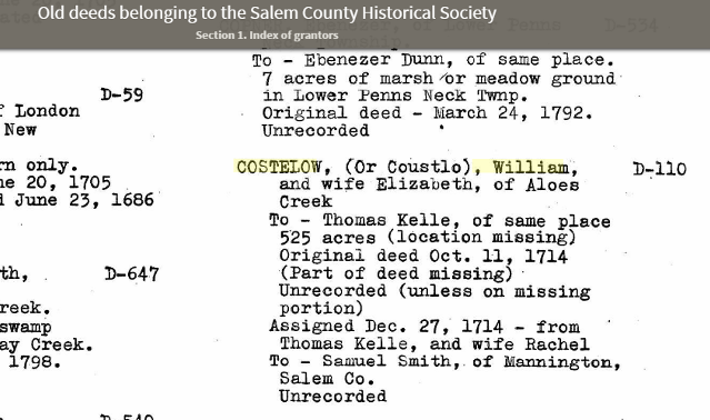 These are just a few of the pieces of information I have acquired which show the early NJ footprints of the Casto family. This first one I frequently use to show how the original Casto name had three syllables or ended in “lo” in early records. It was shown in various records as Costelow, Costabow, Coustlo, etc. This is why I was not surprised when the DNA tests showed connections to the Costello family in Ireland! |